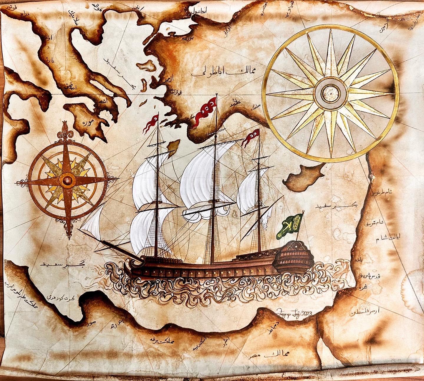 Inspired by 16th-century Ottoman cartography, this work reinterprets the geography of the Mediterranean with refined miniature techniques. Rich in historical and visual elements, the painting features an Ottoman galleon, compass roses, and place names written in Ottoman Turkish, all reflecting the spirit of the age. The artist skillfully blends traditional miniature aesthetics with a contemporary sensibility, using watercolor and gold to add depth and vibrancy. While evoking the atmosphere of a historical document, the work also stands as a compelling piece of visual storytelling.